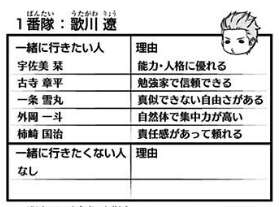 独特なセンスの持ち主の王子ですが、生駒、加古、佐伯、ヒュースの理由が「おもしろい」 か 「おもしろそう」、ヒュースをおもしろそうと評価する辺りのセンスは流石です。そして雨取の理由が「トリオンにロマンがある」、トリオンにロマンを感じているそうです。一緒に行きたくない人は、三輪で理由が「冗談が通じなさそう」です。三輪に冗談言ったら怒られそうですもんね。
