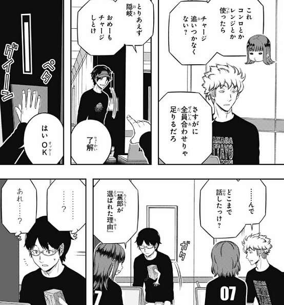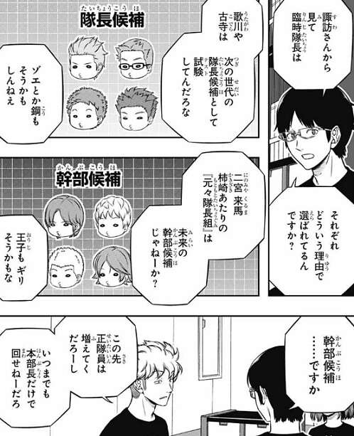 すると諏訪は、歌川、古寺、北添、村上は次の世代の隊長候補としてテストしてんだろうな、といい、二宮、来馬、柿崎、王子は未来の幹部候補としてじゃねーか?と、意見を言います。この先、正隊員が増えていったら、いつまでも本部長だけで回せないだろうから、それを見据えての幹部候補だろうと言います。