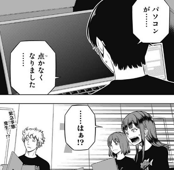 三雲はパソコンを色々いじってみますが、パソコンは何の反応もしません。三雲は、パソコンが……、点かなくなりました……、と全員に言うと、三雲の言葉を聞いた香取は驚きます。
