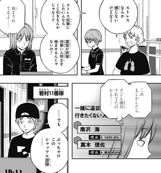 北添4番隊では外岡が、長旅に向けてのストレス耐性テスト的なものだ、と意見を出します。それを聞いて南沢は、ストレスなんか感じないけどな~、と気楽に言いますが、それを聞いた菊地原がくじを操作されていた可能性を思いつきます。