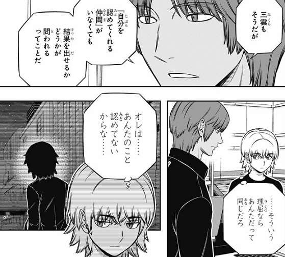 村上10番隊では蔵内が、いつものチームでは表面化しない個人の不安要素を洗い出す目的もあるんじゃないか?と、意見を出します。二宮8番隊では二宮が、三雲、若村、三浦、小荒井、奥寺、影浦の名前を出して、元のチームの環境に依存している人間が、『単独で動けるかどうか』を視るのも目的の一つだろう、と意見を出します。東は奥寺、小荒井はそこまで心配ないと言い、雨取も三雲も大丈夫だと思う、と意見を出します。絵馬も影浦なら問題ない、1人で放っておいても強いし、と言いますが、戦闘面の話だけじゃない、人格的な面も含めてだ、と二宮は言い、影浦、三雲は『自分を認めてくれる仲間』がいなくても、結果を出せるかどうかが問われる、と意見を言います。それを聞いて絵馬は、あんたのこと認めていないからな……、と心の中で二宮を認めていないとつぶやきます。