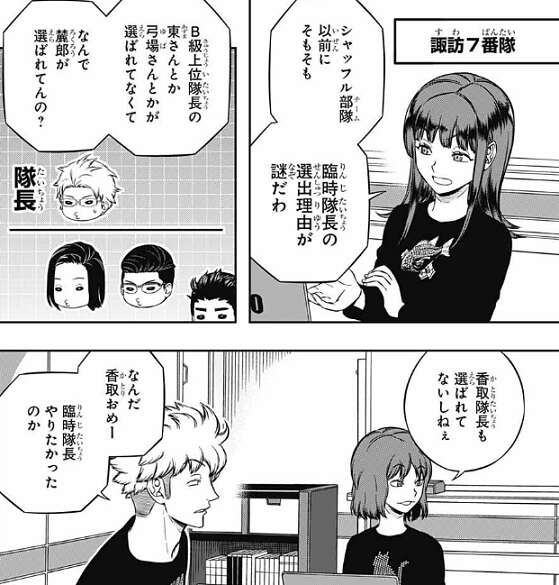 諏訪7番隊では香取が、シャフルチーム以前にそもそも、臨時隊長の選出理由が謎だわ、と若村が臨時隊長に選ばれていることが謎だと、意見を言います。全員同じ理由とは限んねーよ、いろんなパターンで試してんだろう、と諏訪が言うと、三雲が諏訪に臨時隊長がどういう理由で選ばれてるんですか?と、質問します。