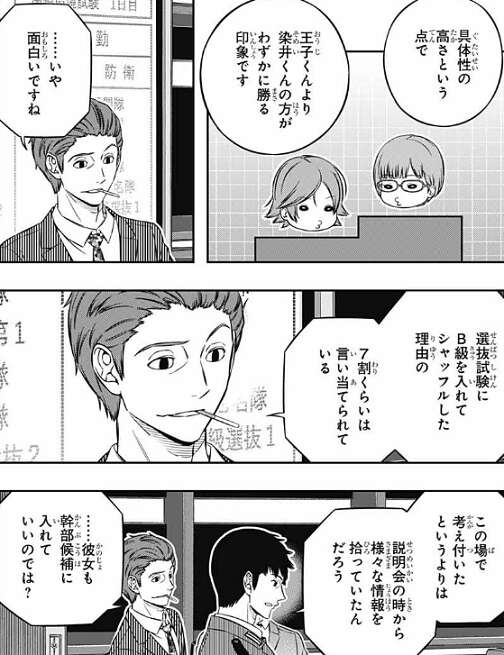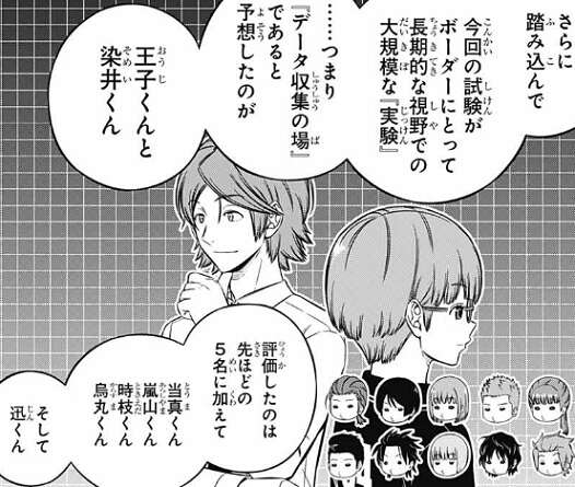 具体性の高さという点で、王子より染井の方がわずかに勝る印象だと、根付が言うと、選抜試験にB級を入れてシャフルした理由の、7割くらいは言い当てられている、と唐沢は評価し、染井も幹部候補に入れいていいのでは?と、言います。しかし、唐沢の意見に根付は、優秀かもしれないがまだ若すぎます、と否定的です。さらに6番隊では木虎が、染井と王子に近い意見を述べている、と城戸が言いますが、6番隊は古寺隊長が時間を制限していたため、木虎はそこまで具体的な話を言わなかったようです。