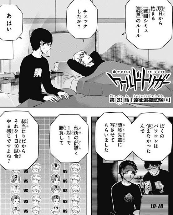 諏訪は、明日から始まる『戦闘シミュ演習』のルールをチェックしたか?と、三雲に確認します。三雲は隠岐のパソコンで確認したと言い、他所の部隊と1対1で勝負して、総当たりなので1日10試合やる感じですよね、と答えます。
