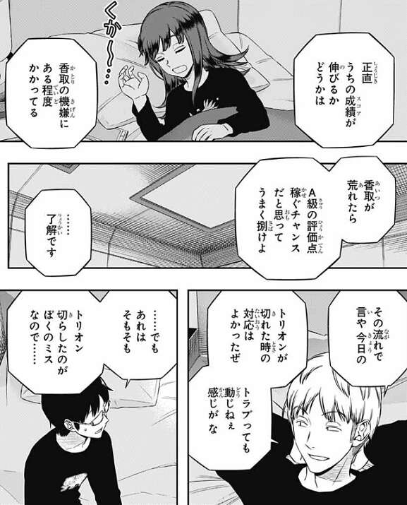 本当に香取が怒って不機嫌になると、会話を拒否るらしいからな、と諏訪は言うと、なるほど……、と三雲は納得します。どうやら諏訪は若村から、事前に香取の事を聞いていたようです。しかし、香取が諏訪7番隊のエースなのは間違いなく、今日の課題も香取がうちのトップだった、と諏訪は三雲に言います。三雲は香取が課題をこなしているとき、気が抜けた感じだったのを見ていたので、意外に感じます。また、オペレーターの宇井は献立作りに時間を使ったので、その分が無ければ課題の得点は香取とトントンになるようです。