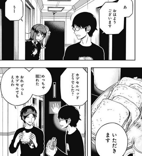 朝、三雲は通信デバイスのアラームで目を覚まし、歯を磨くとトリガーを起動します。そうしていると、眠そうな香取も起きてきます。全員で朝食のサンドイッチを取り、オペ部屋の向かいの部屋にカバーと毛布を持っていきます。その部屋にはケースがあり、ケースの中にはマウスとヘッドセットが入っています。
