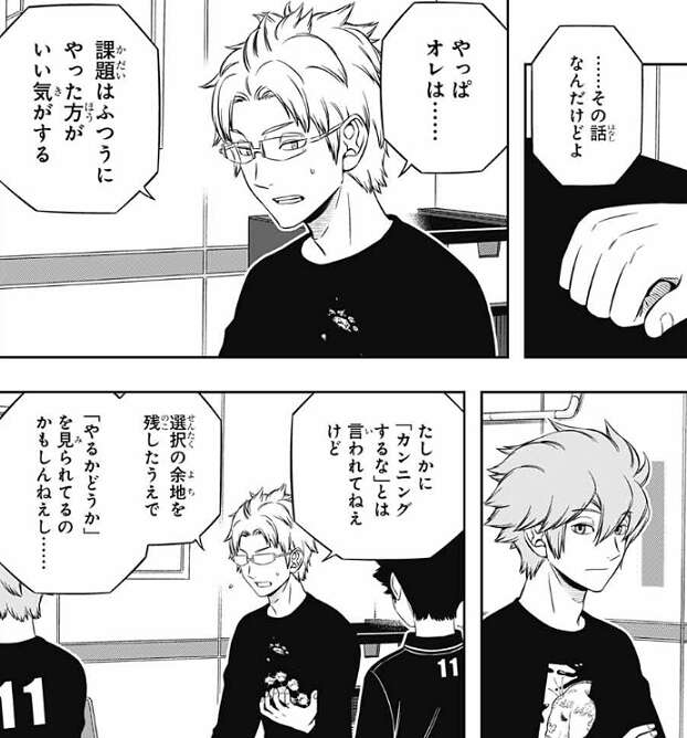 最終的にカンニングが「実はアウト」だった場合、責任が取れねえっつうか……、と若村が皆に伝えると、ヒュースを含め全員が納得し、共通課題は普通に取り組むことになります。しかし、若村はどこか自分が出した答えに納得していないように見えます。