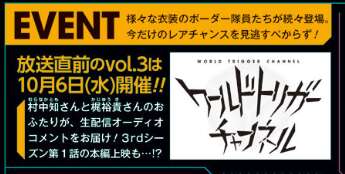 またジャンプSQ 2021年11月号にアニメ「ワールドトリガー」3rdシーズンの情報があり、vol.03の配信がが10月6日(水曜)にあるようです。