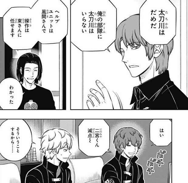 東から『ヘルプユニット』を1人選べるかどうするか?と、二宮は聞かれます。編成的にアタッカーが欲しいと東は言い、加賀美倫も太刀川でいいんじゃない?と、言います。しかし、太刀川はだめだ、俺のチームに太刀川いらない、と二宮は太刀川をヘルプユニットに加えることを拒否し、風間をヘルプユニットに加えます。それを見ていた太刀川は、二宮に減点を加えて、出水から呆れられてしまいます。