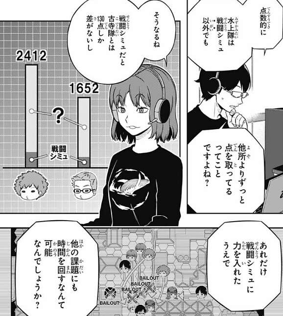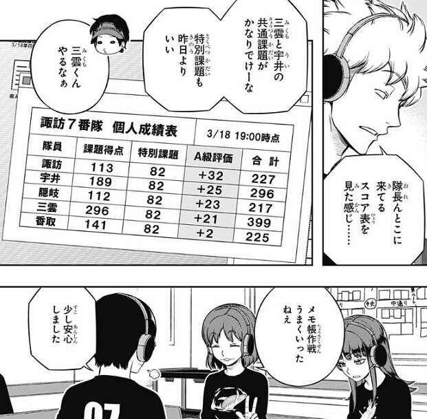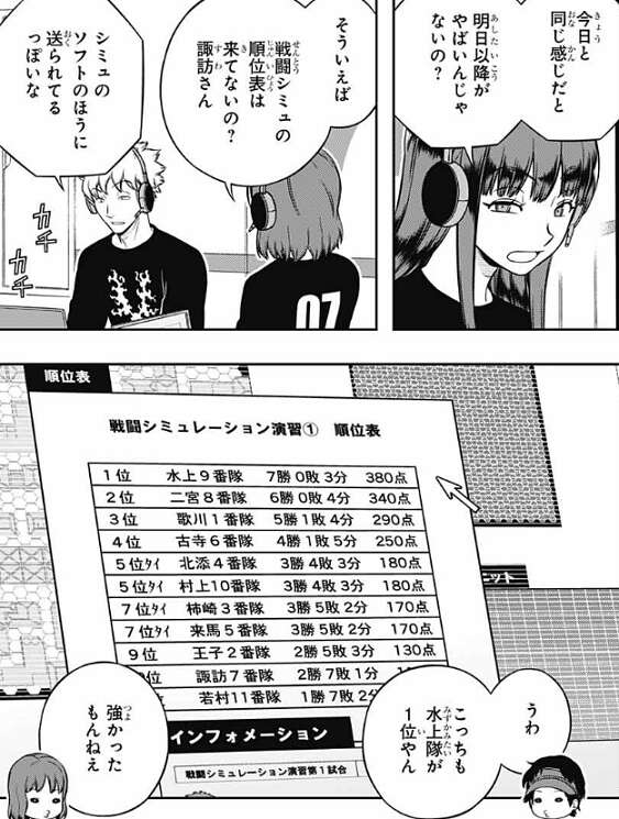 二日目の分の順位表を見ると、水上9番隊が2,412ptと2位に760点差をつけて他チームを引き離しています。諏訪7番隊では三雲が、水上9番隊が戦闘シミュに力を入れたうえで、他の課題でも得点を取っている所を気にしています。水上9番隊がこれだけ断トツの一位だといやでも目立ちますし、諏訪も何か掴んだようなので、水上がやっている事にそろそろ気付くかもしれません。