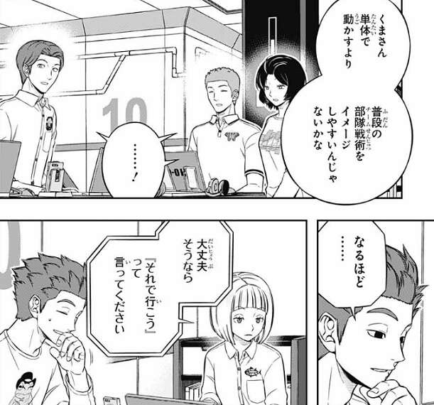 氷見は明日、同じような特別課題が来た場合どうするのか、今決めた方がいい、と意見を言うと、村上にだけ『氷見の意見は?』……って訊いてください、と話しかけます。村上がその通り氷見に聞くと、特別課題は蔵内がやるべきだと思うと言います。そして、蔵内のユニットは熊谷が操作すればいい、蔵内は足が速くて合成弾持ちだから、那須と似た感じで動かせるはず、と熊谷に言います。