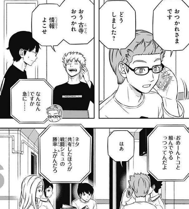 そして三雲が意見を出す番ですが、思いついたことはいくつかあるが、データが足りなくて心許ない、と言います。しかしデータはここにあるので全部だ、と隠岐が言うと、三雲は他所のチームに訊いてみようと思うと言い、諏訪が古寺にデバイスを使って連絡することになります。