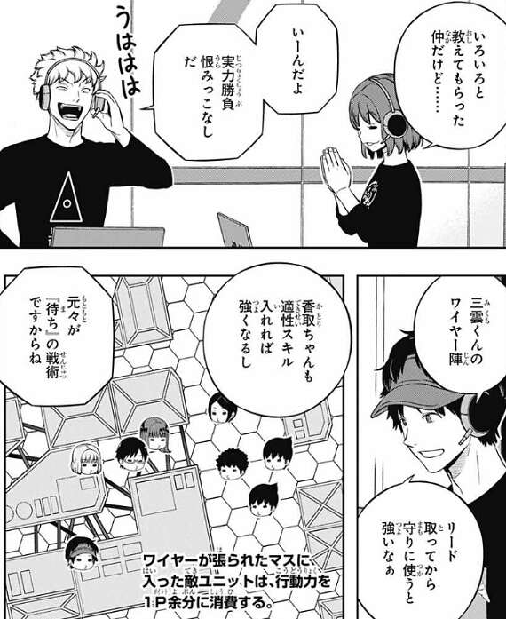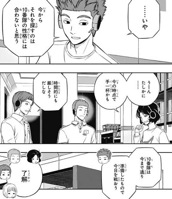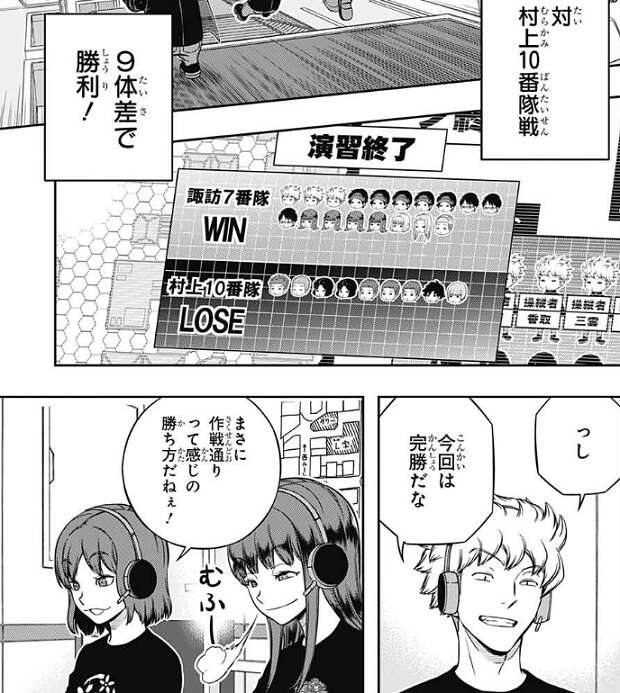 一方、運営本部デスクでは、各チームの戦闘シミュの様子を審査しています。運営本部デスクでは、日程が進むほど引き分けが多くなると事前に予測していたようですが、諏訪7番隊のように既に3勝しているチームもあり、予測より勝ち負けに偏りが出ているようです。諏訪7番隊が『隊長が3人いるのを活かした戦術』で3勝し成果を出したので、唐沢が似たような事を言っていた、と根付がつぶやきます。