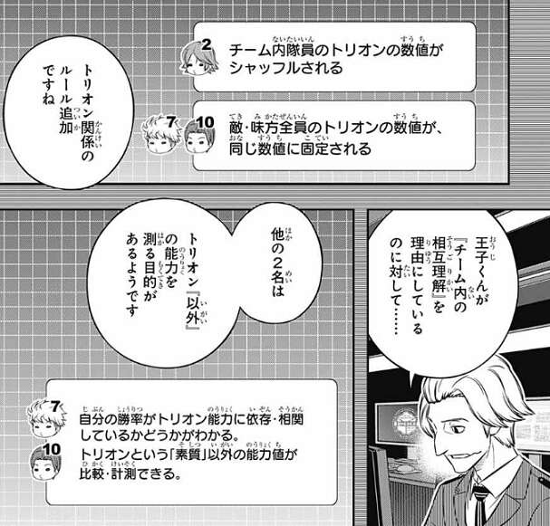 そして、閉鎖環境試験 5日目から始まる特殊戦闘シミュの詳細が明らかになります。専用ソフトを使って、オリジナルのトリオン兵を各隊員1体以上作成し、特殊戦闘シミュで操作しなさい、というものでした。各隊員1体以上作成、という事は何体も作成しても問題ないように見えますが、その辺りは専用ソフトで多分制限が掛けられているのでしょう。他にも特別課題③で新しいアイデアがたくさん出ていたので、他のアイデアも採用されていてもおかしくありません。どんな特殊戦闘シミュになるのか、各チームはどう対応するのか、今後の展開も楽しみです。
