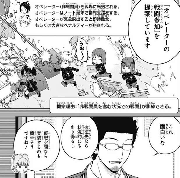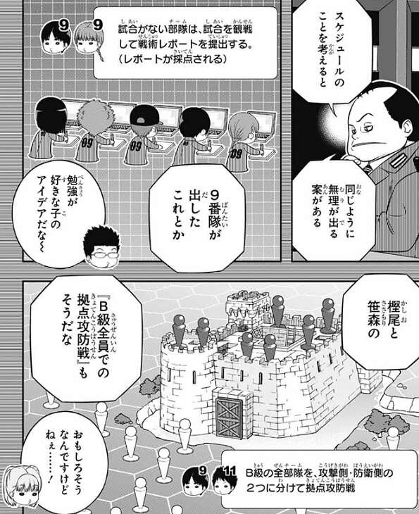 オペレーターが操作するのだと、処理能力でかなり差が出て来そうなことを武富は懸念します。しかし、トリオン兵はある程度勝手に戦ってくれるから、そこまで大変じゃないと言う意見が林藤から出ます。鬼怒田は、既に決まったことに文句は言いたくないが、トリオン兵を扱う部門と、トリガーを扱う正隊員は分けた方がいい、と意見を言います。トリオン兵に頼る戦い方を覚えてしまったら、B級中位以上と下位の差が開くことになる、と鬼怒田は懸念します。