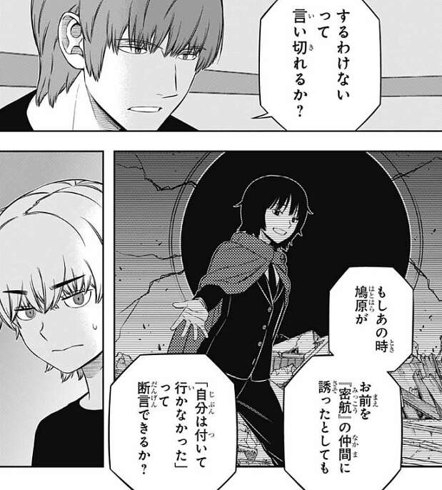 しかし、もしあの時鳩原が絵馬を『密航』の仲間に誘ったとしても、「自分は付いて行かなかった」って断言できるか?と、二宮に言われて絵馬は何も言えなくなってしまいます。さらに絵馬が選抜に漏れて、それでも鳩原を探したいと言ったら、影浦隊の連中はなんだかんだ協力しようとするんじゃないのか?と、言われて絵馬は何も答えられません。