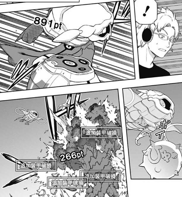 しかし二宮隊のユニットの内の1体は、ブースト攻撃で機動力を瞬間的に高めて一気に距離を詰めて、若村隊のユニットを2体瞬殺します。一方、ヒュースの爆撃機は見た目のヤバそうな大物ユニット1体を投擲弾で攻撃します。すると、追加装甲破損と何度か表示された後大物ユニットは倒され、266ポイントが若村隊に加算されます。