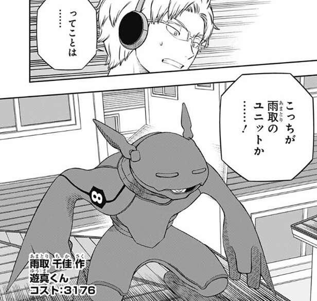 266ポイントという事でポイントは低く、この大物ユニットは実はコストがかかっておらず、そんなに強くなさそうです。一方、二宮隊の部屋では大物ユニットが倒された時に、あーっ私の『嵐の塔』が!と、加賀美が叫んでいます。どうやらあの大物ユニットを作成したのは加賀美で、『嵐の塔』と加賀美は名付けているようです。雨取が作成したユニットはブースト攻撃をしたユニットの方で、遊真くんと命名されています。コスト3,176とかなりコストがかかっていて、遊真くんと命名している事から空閑をイメージしたユニットのようです。