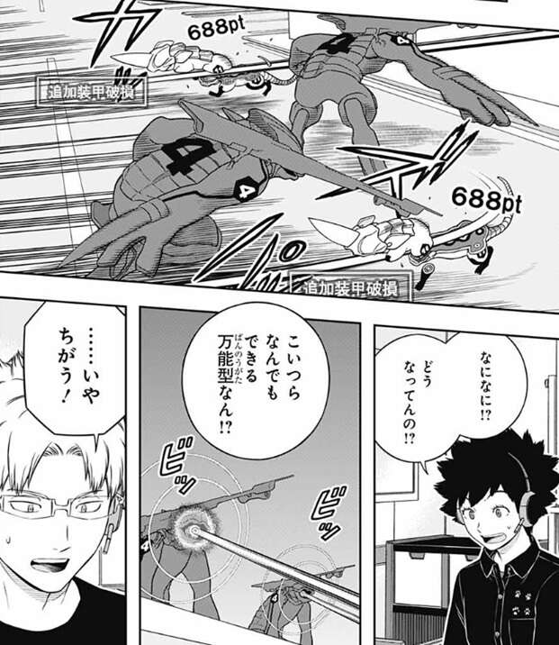 『追加装甲』も本体の装甲と同じように自由に形を変えられるんじゃないか?と、ヒュースは言いますが、見た目への手間がすごいと半崎が驚きます。そして、半崎は加賀美が作った粘土人形に似ているとつぶやきます。加賀美の趣味はカラー粘土細工で、美大への進学も決まっている創作系オペレーターなので、あの独特の見た目のユニットも趣味のカラー粘土細工の技術を生かして、加賀美が作ったものなのでしょう。あの独特の見た目のユニット3体で注意を引き付けて、雨取作の遊真くんで敵ユニットを蹴散らすのが二宮隊の作戦なのでしょうが、ヒュースの爆撃機には遊真くんの攻撃が届かないので、安心して若村隊は行動できたようです。
