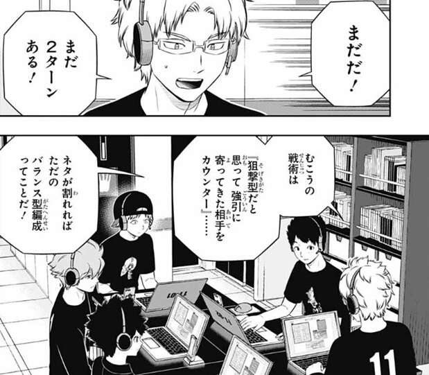 ヒュースの爆撃が上手く敵の連携を邪魔した形となり、古寺隊が連携出来ず若村隊がすんなりと勝利できたようです。古寺隊は『昨日までの試合』を踏まえた動きをしていて連携を組もうとしていたようですが、今日に限ってはそういった勤勉さや正確さが裏目に出たようです。ヒュースは、意外性や特殊な発想が勝率に結びつくはずだ、と特殊戦闘シミュで重要な点が戦闘シミュとは違う事をチームメンバーに言います。