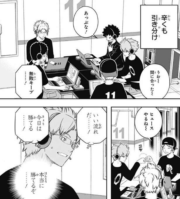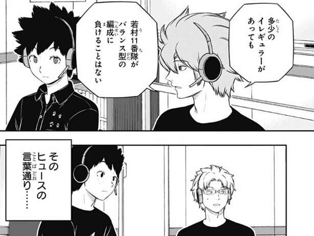 若村は後ろに回った弓場のステルス鉄砲玉を先に倒すべきだったか?と、内心後悔しますが、ヒュースは多少のイレギュラーがあってもうちがバランス型の編成に負けることはない、と自信をもって断言します。そして、そのヒュースの言葉通り2試合目の古寺6番隊との試合は3千点差が付いて、若村隊が勝利します。