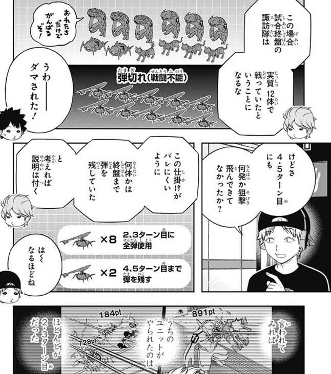 つまり諏訪隊の『性能負けしない22体の大群』は、攻撃を2ターンのみに限定することで成立していた、とヒュースは自分の推測を説明します。ヒュースの推測が正しければ、2ターン限定の戦術なので、残り3ターンは狙撃型の戦闘力を捨てて性能とコストを両立させることが出来そうです。その場合は最後の2ターンは狙撃型は戦闘に参加していなかったことになります。