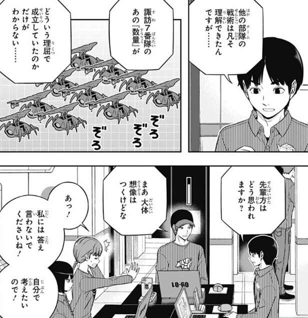 一方、樫尾は諏訪隊のトリオン兵の『数量』がどういう理屈で成立していたのか分からず、悩んで難しい顔をしていたようです。樫尾は先輩達に意見を求めますが、照屋は私には答えないでくださいね!自分で考えたいので!と、荒船に注意します。水上は頭の中で考えるより、トリオン兵つく~るいじながらのほうがわかりやすいんちゃう?と、照屋と樫尾にアドバイスします。もう答えが分かってそうな水上に照屋は、もう答えがわかってるんですね?と聞きますが、水上は分かっていないように振舞ってごまかします。