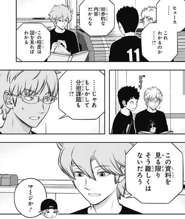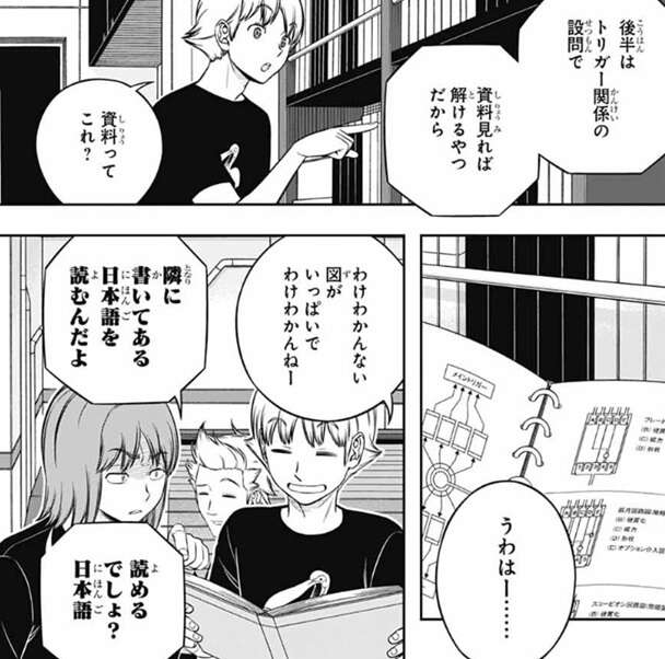 場面は若村11番隊に移り、若村隊もトリガー関係の資料を見ています。南沢はお手上げでしたが、ヒュースは資料を見て、…なるほど、トリオン工学の基礎だな、とつぶやきます。笹森にこれ分かるのかと聞かれて、初歩的な内容だからな、この程度は図を見ればわかる、とヒュースは答え、分担課題もこの資料を見る限りそう難しくはないだろう、と言います。それを聞き半崎は、マ~ジか!と驚きますが、表情を見る限りヒュース以外の若村隊のメンバーには工学系の課題は難しそうです。