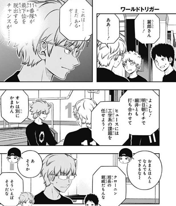ヒュースの言葉を聞き、うちが最下位を脱出するチャンスがまだあると希望を持った若村は、明日朝イチで細井と打ち合わせをして、ヒュースに工学系の課題を任せる方針を立てます。ヒュースも構わないと了承しますが、半崎と笹森は、ヒュースはほんと何でもできるな、クローニンチーフの親戚だもんな、とヒュースを褒めます。ヒュースは対外的には、玉狛支部所属のエンジニア・クローニンの親戚という設定になっているので、クローニンの親戚だから何でも知っているという感じでメンバーは納得します。