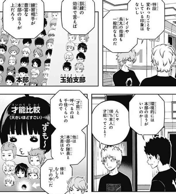 玉狛支部の指導は一般的なもので、訓練の効率で言えば練習相手が豊富な本部のほうが上だとヒュースは言います。『才能』と呼べるものも雨取ぐらいで、他は本部の隊員と大差はなく、三雲にいたってはむしろ『下の中』だと厳しい事をヒュースは言います。玉狛の人間との差を感じとしたらそれは、単純に実力の問題だろうな、とヒュースは言いますが、若村は『実力』という言葉に引っかかります。