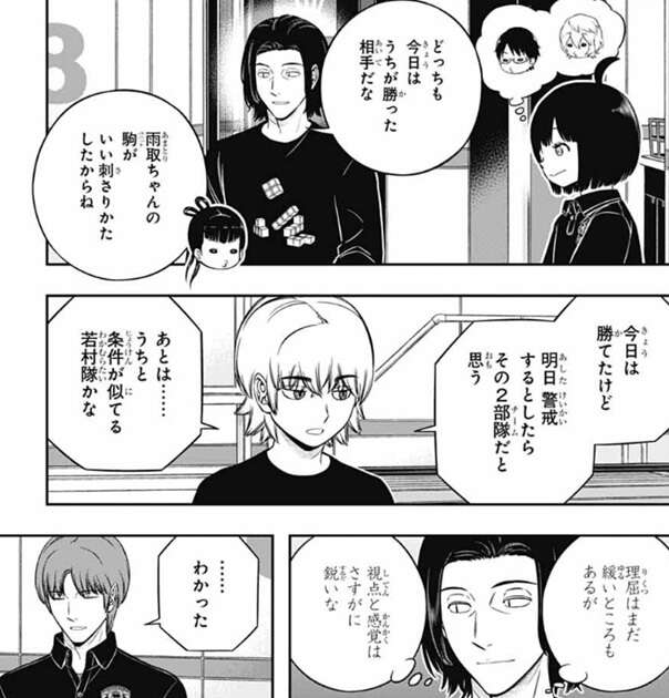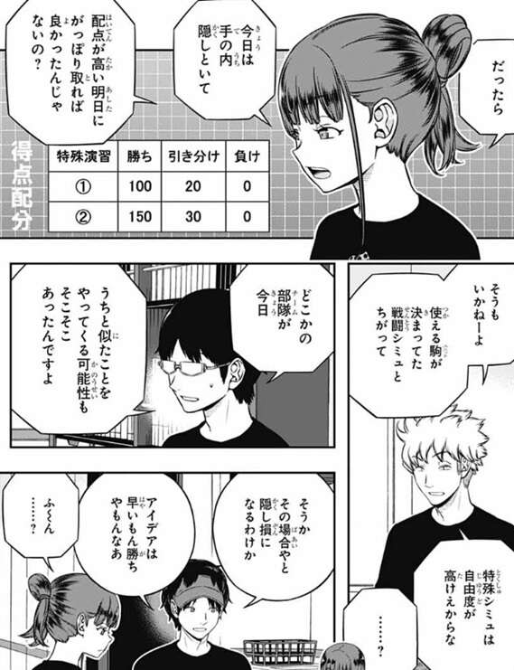 諏訪は理由として昨日、今日とシミュでバカ勝ちしているからと言い、どういう状況か分かるか?とメンバーに聞きますが、三雲が戦闘シミュの初めの頃の水上隊と二宮隊を例に出します。水上隊と二宮隊は戦闘シミュで初めの頃バカ勝ちしましたが、目立ってしまい対策をされて勝ちにくくなり、成績を落としました。諏訪は諏訪隊も総合2位まで上がって目立ってきたので、対策されるのは当たり前と言います。香取は、だったら今日は作戦を隠しておいて配点が高い2日目に作戦を使い、がっぽり得点を取ればよかったと言います。しかし、使えるユニットが決まっている戦闘シミュと違って特殊シミュは自由度が高いと諏訪は言い、三雲もどこかのチームが今日諏訪隊と同じ作戦をやってくる可能性がそこそこあったと言います。