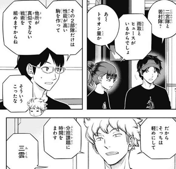 『読み』以上の作戦が取れるのはトリオン量が高い雨取とヒュースがいる二宮隊と若村隊だけで、その2チームは雨取とヒュースが性能の高いユニットを作って、他所が真似できない戦術を組めると諏訪と三雲は言います。そこで諏訪隊は三雲以外に関しては分担課題に時間を回すと諏訪は指示し、三雲にはシミュ担当となりなるべく省エネの戦術を組むように指示します。『刺さるやつには刺さる』くらいの感じで、全チーム対策はしないように諏訪は三雲に注意します。