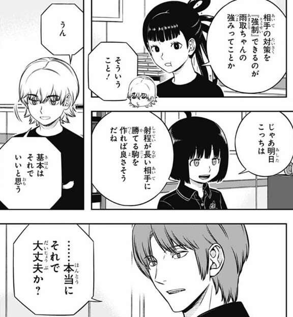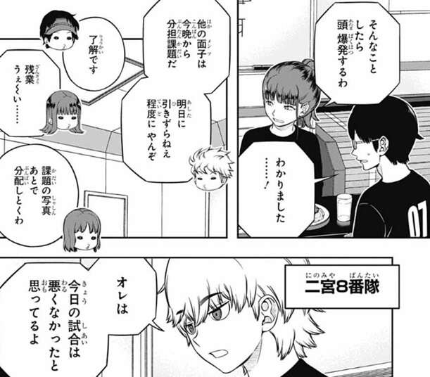 よって二宮隊の明日の作戦は、射程の長い相手に勝てるユニットを作ると言う方針に決まりかけます。しかし絵馬の考えに対して二宮が、それで本当に大丈夫か?と、意見を言います。相手がリスクを度外視して、裏を掻いてくる可能性もあるぞ?と、二宮は絵馬に意見を言います。絵馬も二宮の意見に対して、その可能性はあると答えますが、それでもランク戦をずっとやって来てB級隊員には『まじめな人』が多いと思うと言います。まじめな人だから、負けたら反省し、やられたら対策をする、そういう人が多いと絵馬は言います。
