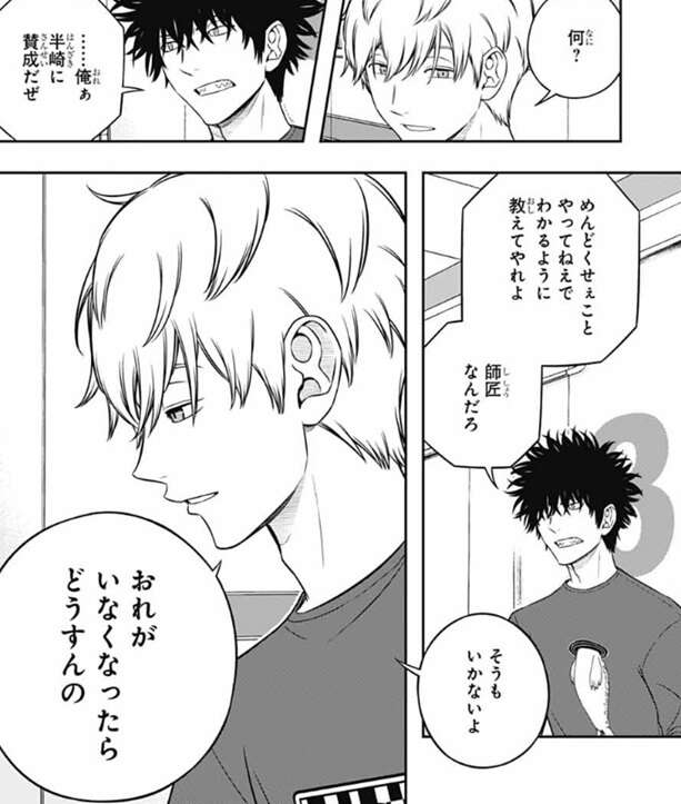 先ほどまでの通信デバイスでの会話を聞いていた影浦は、半崎のふつうに「自分で考えろ」って言えばいいと言う考えに賛成し、師匠なんだから面倒なことやっていないでわかるように教えてやれよと犬飼に言いますが、おれがいなくなったらどうすんの、と犬飼は答えます。