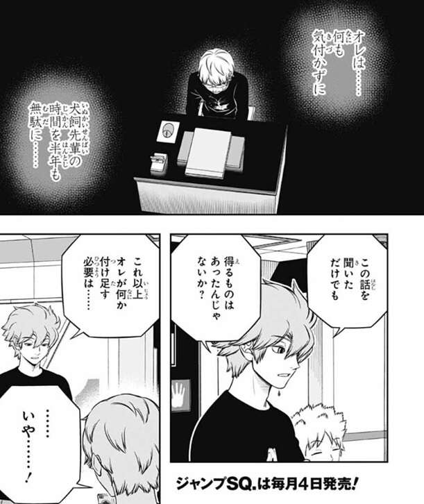 犬飼の考えに半年も気付かず、犬飼の訓練を受けていた若村はショックを受けて、何も気付かずに犬飼先輩の時間を半年も無駄に……、と心の中でつぶやきへこみます。ヒュースは、この話を聞いただけでも得るものはあったはず、と言い、これ以上自分が付け足す必要はないと言いますが、若村はここまで来て退けないとヒュースに答えます。