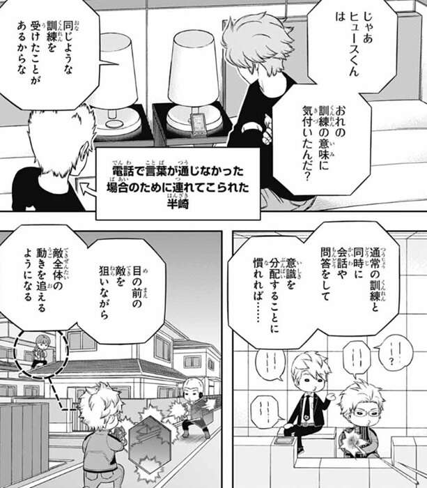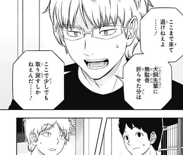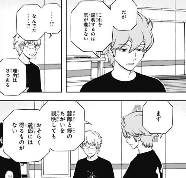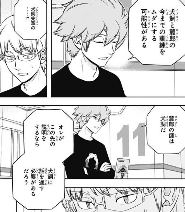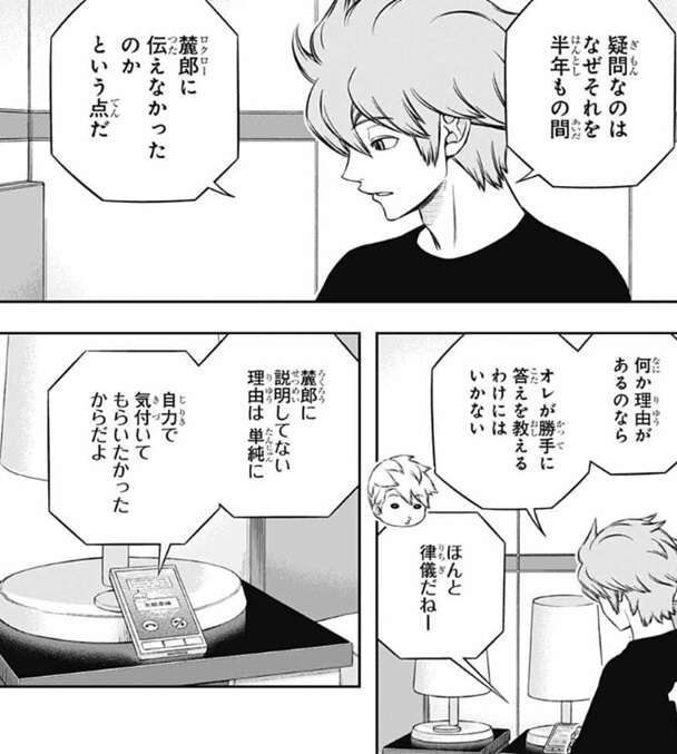 そしてヒュースは、疑問なのはなぜそれを半年もの間、若村に伝えなかったのかという点を気にしていて、何か理由があるのならオレが勝手に答えを教えるわけにはいかない、とヒュースは言います。すると犬飼は、ほんと律儀だねー、と言い、麓郎に説明してない理由は単純に自力で気付いてもらいたかったからだよ、と犬飼は訓練の意味をあえて説明しなかった理由を明かします。