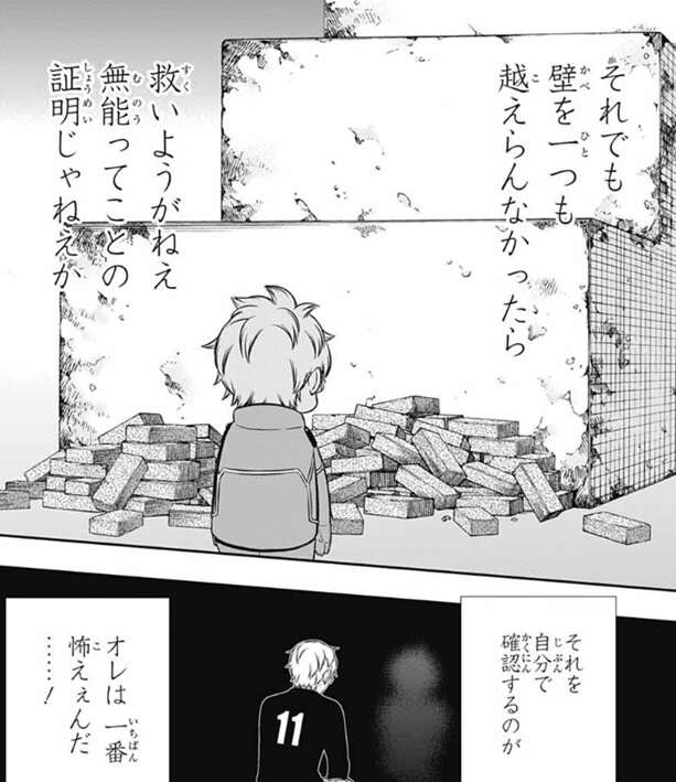 これ以上無い小ささまで一段一段刻んで、バカでも努力できるようにお膳立てさせて、それでも壁を一つも越えらんなかったら、救いようがない無能ってことの証明になり、それを自分で確認するのが一番怖いんだ、と若村は改めて気付き落ち込んでしまいます。ここでヒュースは突然、若村は自転車に乗れるか質問します。当然自転車くらい乗れるので、乗れると若村が答えると、ヒュースは、なら大丈夫だ、と言い、お前にはできる、と断言します。そして、ヒュースは自分が自転車に乗れないことを明かします。