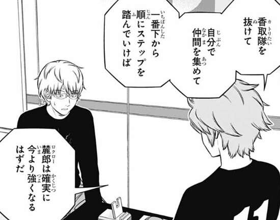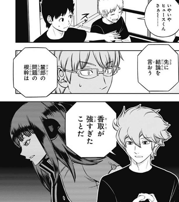 これは足し算や掛け算を知らない人間が高度な算術に挑んでいるようなもので、この条件でまともな解答を出せる人間はいないだろうとヒュースは言い、若村が外に『答え』を求めがちなのはこの辺りに原因があるように思える、とヒュースは指摘します。そして、この問題は己を知り、適正なレベルに挑戦することで解決するとヒュースは言い、香取隊を抜けて自分で仲間を集めて一番下から順にステップを踏んでいけば、若村は確実に今より強くなるとヒュースは言います。