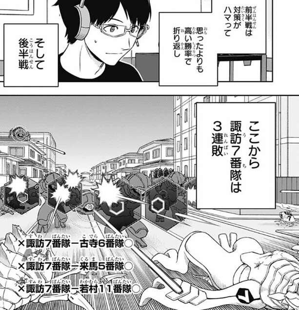 三雲の予想通り壁ユニットを用意しているチームが多く、『急所攻撃』もちゃんと刺さっているようで、三雲の省エネ作戦がちゃんとハマっています。しかし、後半戦になると諏訪隊は三連敗を喫します。