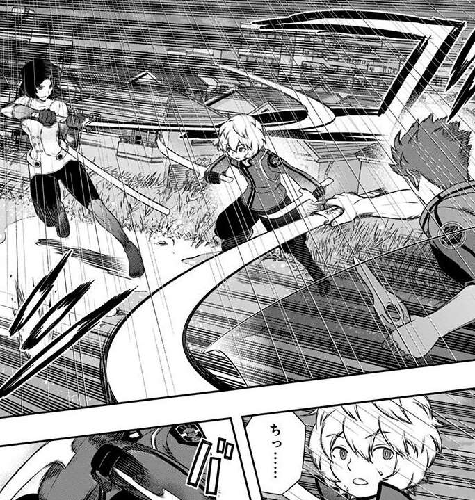 MAP東側での戦いが進むと、三雲の指示で雨取が堤防を破壊して川の水を住宅地に引き込む作戦をとります。