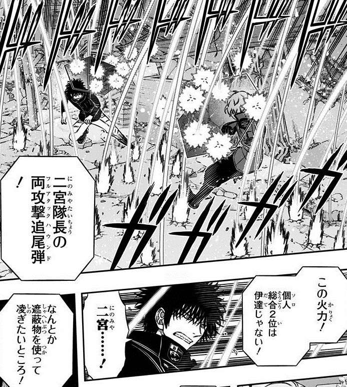 場面変わって、建物内では二宮が絵馬を倒し絵馬が緊急脱出します。北添は影浦をメテオラで援護射撃しますが、東はなんと直接弾を防ぎます。