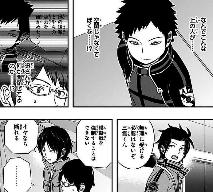 三雲はA級の緑間から大勢の前で一方的に負けてしまいますが、わざとそういう状況を作った緑間に空閑は内心起り、緑間に個人のランク戦を挑みます。空閑は全ポイントを賭けて、緑間は三雲を「先輩」と呼ぶよう指定します。個人戦10本勝負を始めた二人ですが、最初の2戦では空閑は緑間に圧倒されてしまいます。